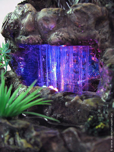 Вода в виде водопада течет на уступ скалы, затем просачившись течет ниже в виде дождя, который подсвечивается разноцветной подсветкой. Данный декоративный фонтанчик интересен тем, что в нем совмещены сразу и дождь, и водопад при относительно недорогой цене.
